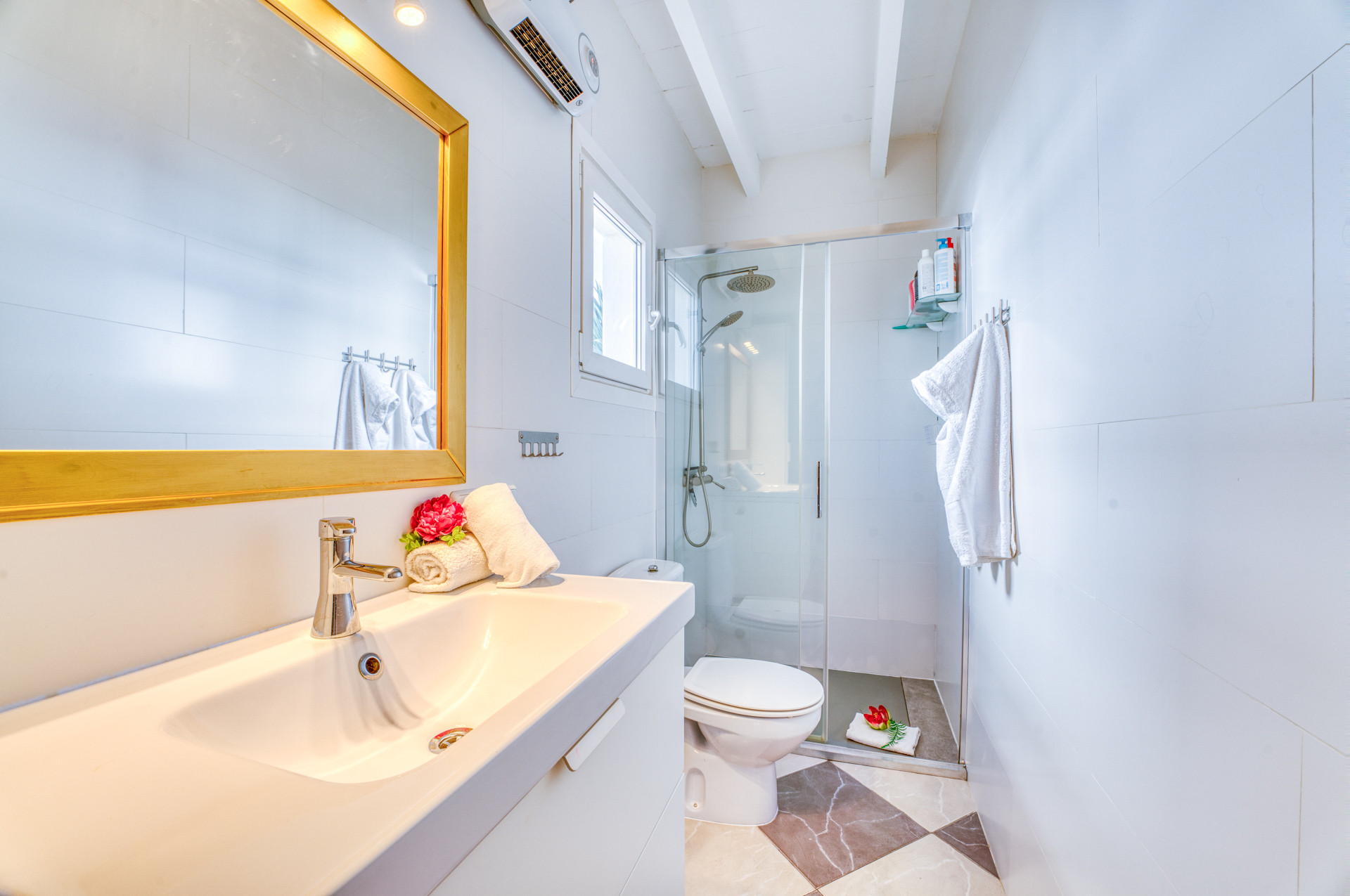 Der eingezäunte Garten, umgeben von einem gepflasterten Boden, wird zu deiner eigenen Oase der Ruhe. Mit bequemen Sofas, Sesseln und einem Tisch für 8 Personen ist dieser Außenbereich perfekt zum Entspannen. Genieße die mediterrane Brise, während du dich in den zwei Hängematten ausruhst, dich in der Außendusche erfrischt oder ein köstliches Barbecue zubereitest. Der Garten, geschmückt mit verschiedenen Pflanzen und einem dekorativen mallorquinischen Brunnen, wird zu deiner persönlichen Ruheoase für entspannte Nachmittage.