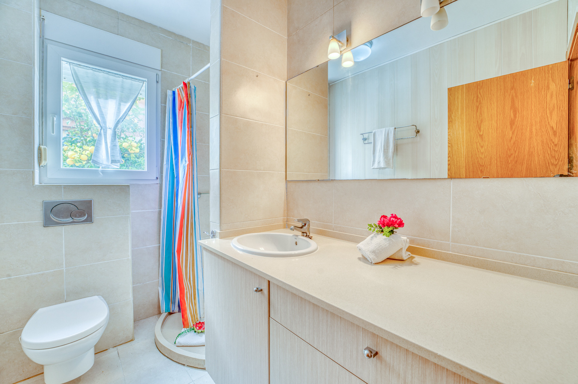 Im Erdgeschoss befinden sich die restlichen Schlafzimmer neben einem Badezimmer mit Badewanne. Diese Etage verfügt über zwei Schlafzimmer mit Doppelbett und eines mit zwei Einzelbetten. Eines der Doppelschlafzimmer verfügt über einen privaten Balkon mit Tisch und Stühlen, ein perfekter Ort, um den Tag mit einem einzigartigen Sonnenaufgang auf Mallorca zu beginnen. Alle Zimmer sind mit Klimaanlage ausgestattet, um maximalen Komfort zu gewährleisten. Darüber hinaus bietet das Haus ein zusätzliches Badezimmer mit Dusche im Freien und verfügt über Fernsehen und WLAN-Verbindung.