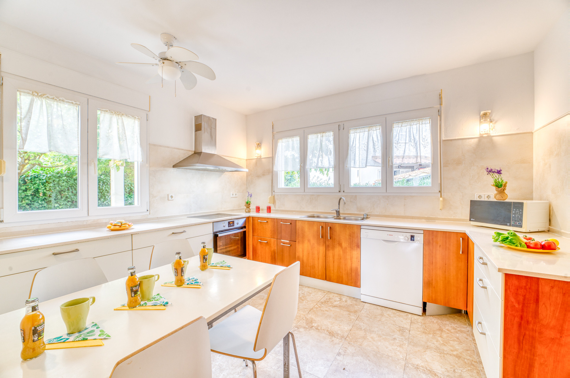 Beim Betreten des Hauses entdeckst du ein modernes und lichtdurchflutetes Interieur. Das Wohnzimmer, mit seinen zwei Sofas, Satelliten-TV und einem Esstisch für 8 Personen, verbindet sich harmonisch mit dem Garten durch Doppeltüren. Die Küche, ebenfalls mit Zugang nach draußen, ist darauf ausgelegt, alle deine Bedürfnisse zu erfüllen, mit einem intimen Raum für besondere Frühstücke.