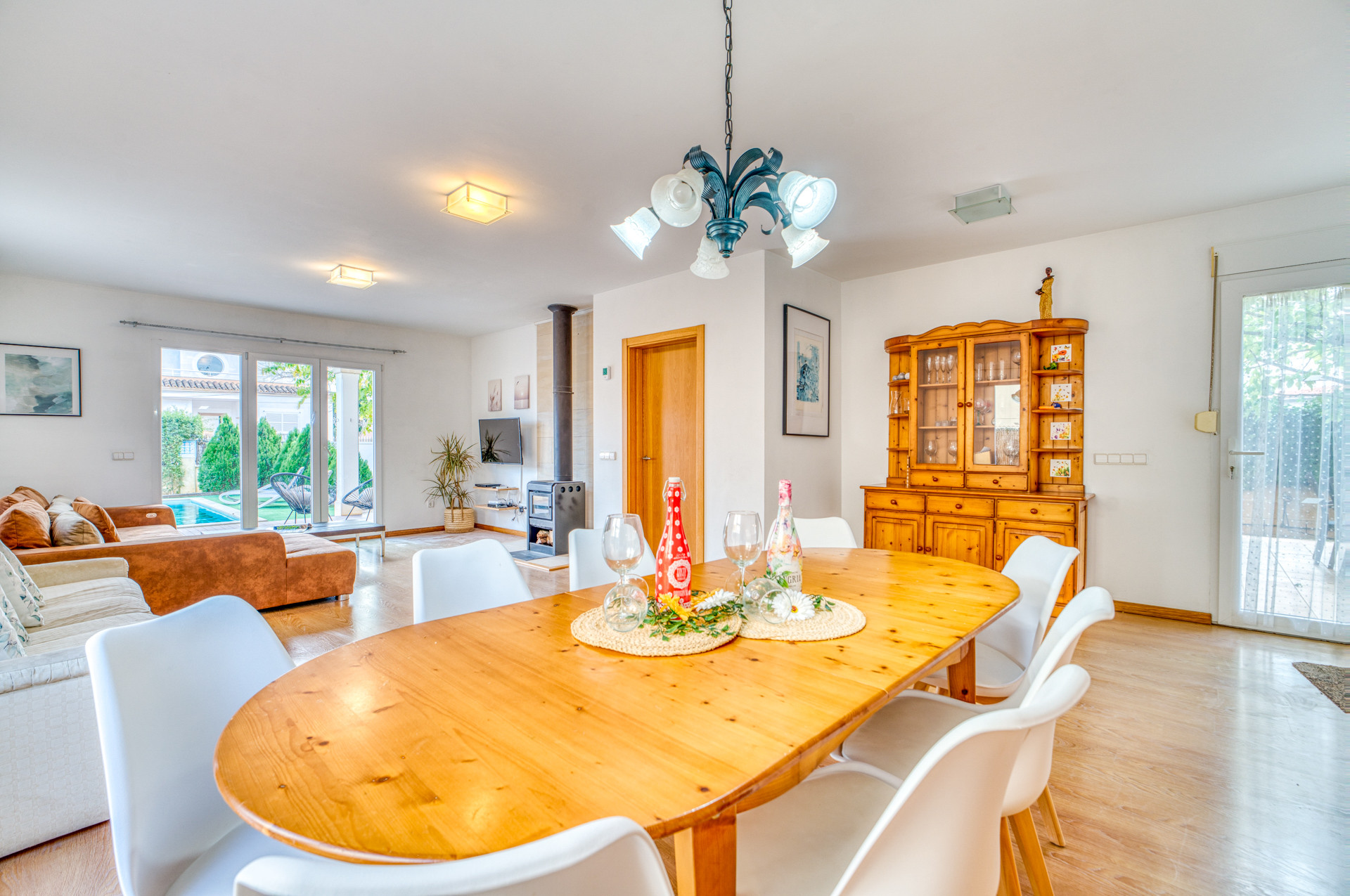 Das Haus verfügt über alles, was man für einen komfortablen Aufenthalt benötigt. Ein großer Salzwasserpool mit 8 Sonnenliegen lädt zum Entspannen ein, während die überdachte Terrasse mit Holz-Esstisch die idealen Bedingungen für angenehme Abende im Freien schafft.