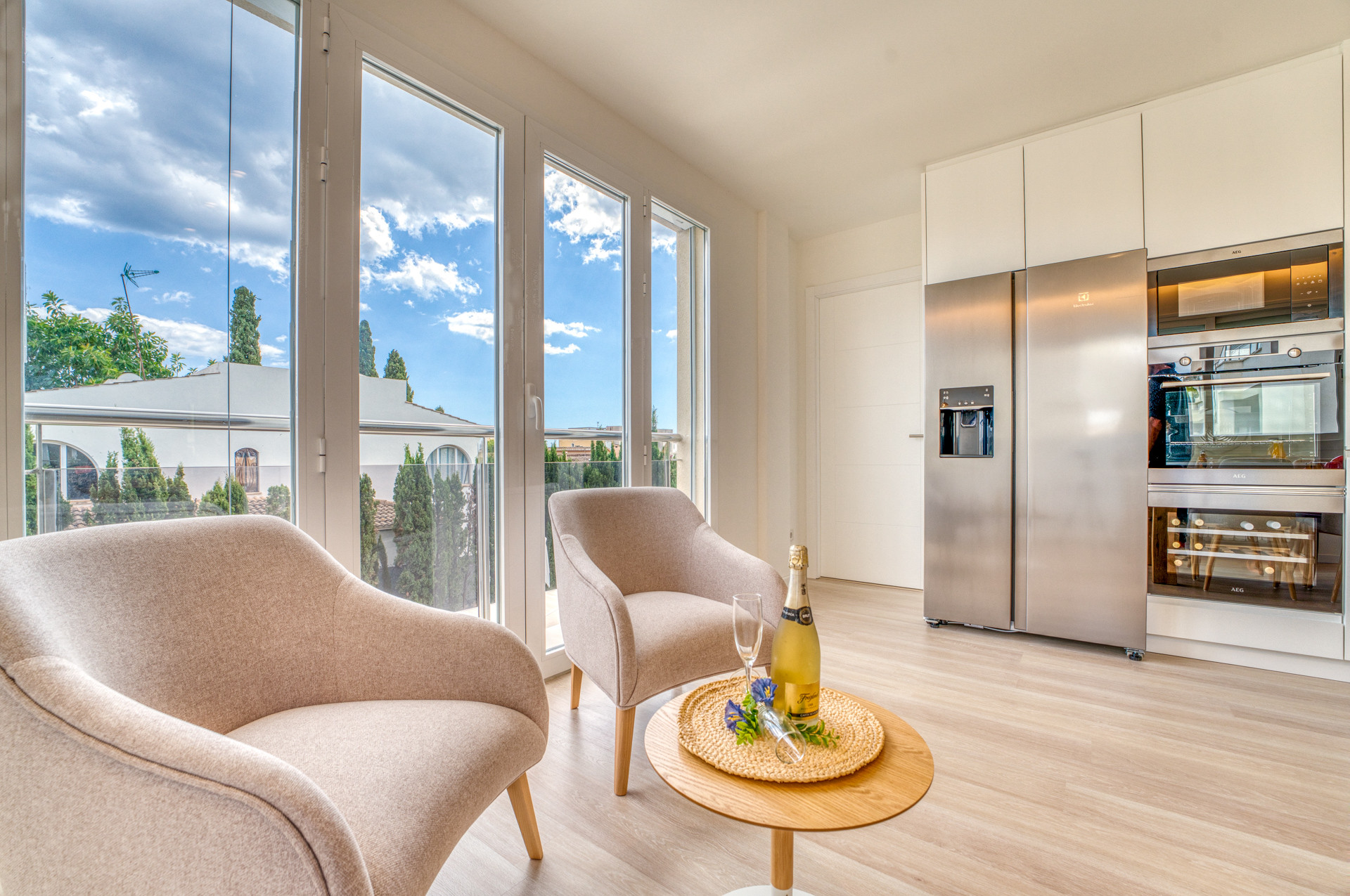 Relájese en la zona exterior con piscina comunitaria, rodeada de hamacas y sombrillas, ideal para tomar el sol y desconectar. Además, la terraza privada es el lugar perfecto para tomar el desayuno, leer o disfrutar de una copa por la tarde bajo el cielo mallorquín.