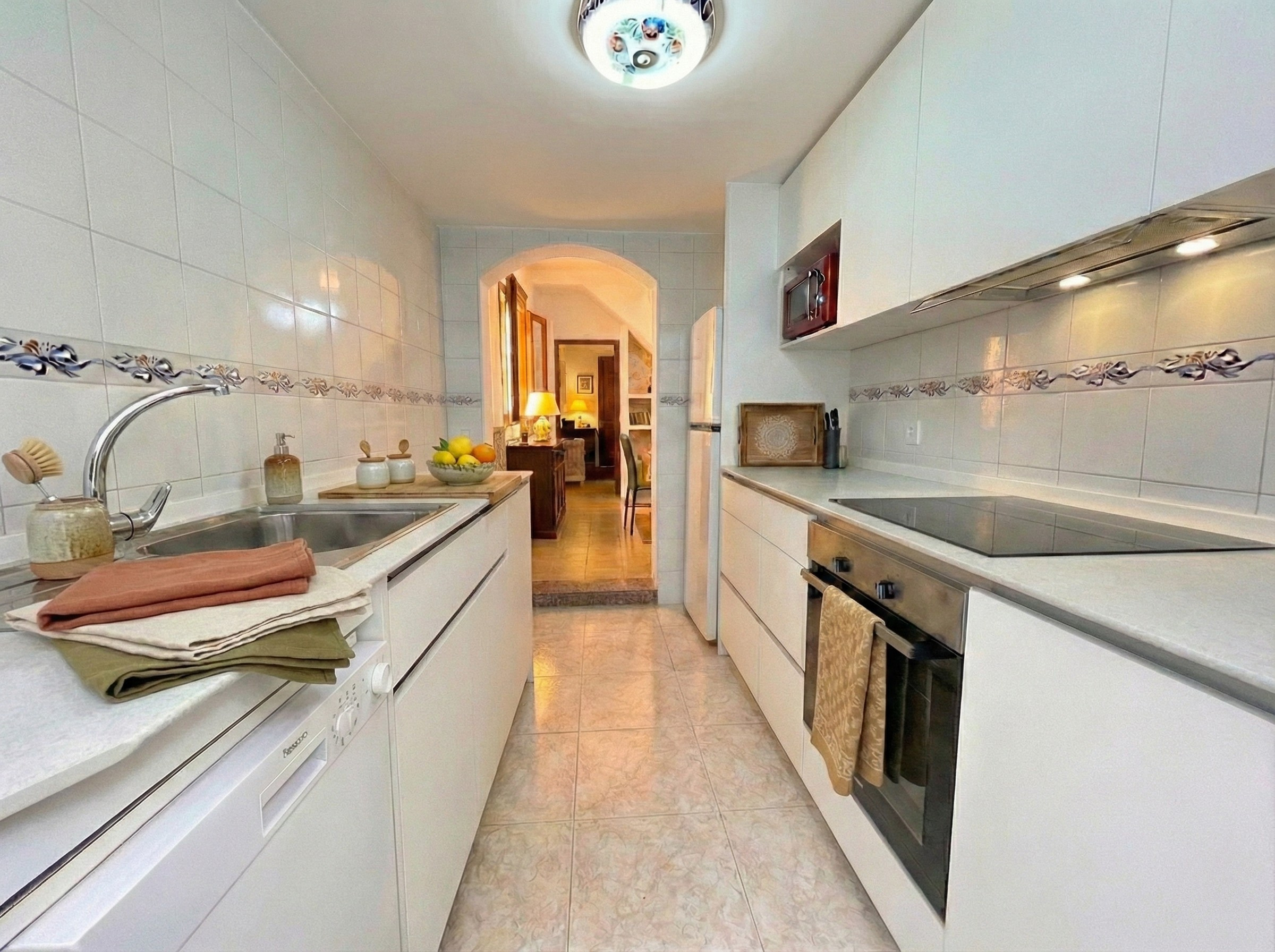 En un área abierta sin puertas, hay un acogedor comedor con un área cuidadosamente decorada donde podrá disfrutar de comidas culinarias con familiares o amigos. En la espaciosa cocina, puede preparar los productos locales que se ofrecen en el mercado de Alcudia los martes y domingos. La cocina está equipada con todos los electrodomésticos necesarios, incluido un lavavajillas.