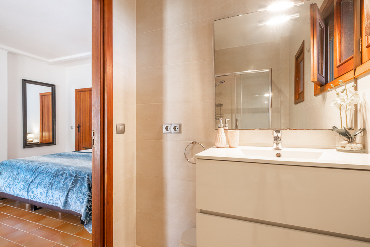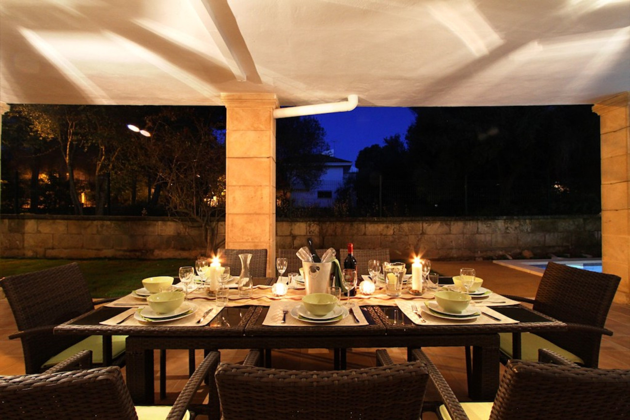 La villa destaca por sus espectaculares exteriores, con una piscina privada de cloro de 8 x 4m con vistas panorámicas al mar, rodeada de una elegante terraza amueblada y una zona de chill-out con tumbonas, perfecta para relajarse bajo el sol de Mallorca. También cuenta con una zona de comedor al aire libre con barbacoa, ideal para disfrutar de cenas tranquilas en noches de verano. Junto a la piscina, hay una cocina adicional, muy práctica para comidas al aire libre sin necesidad de acceder al interior.