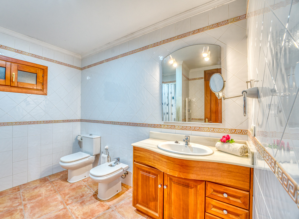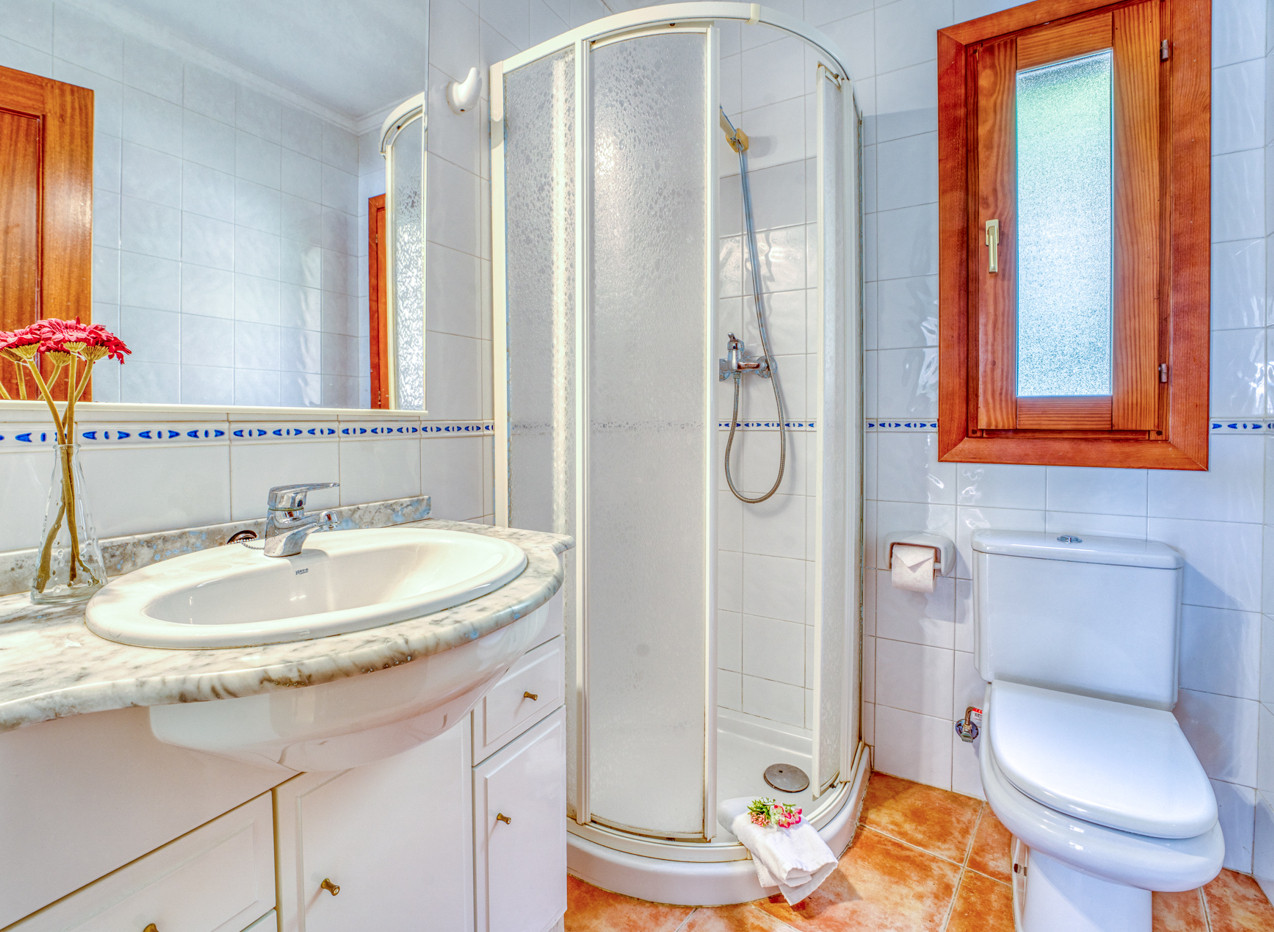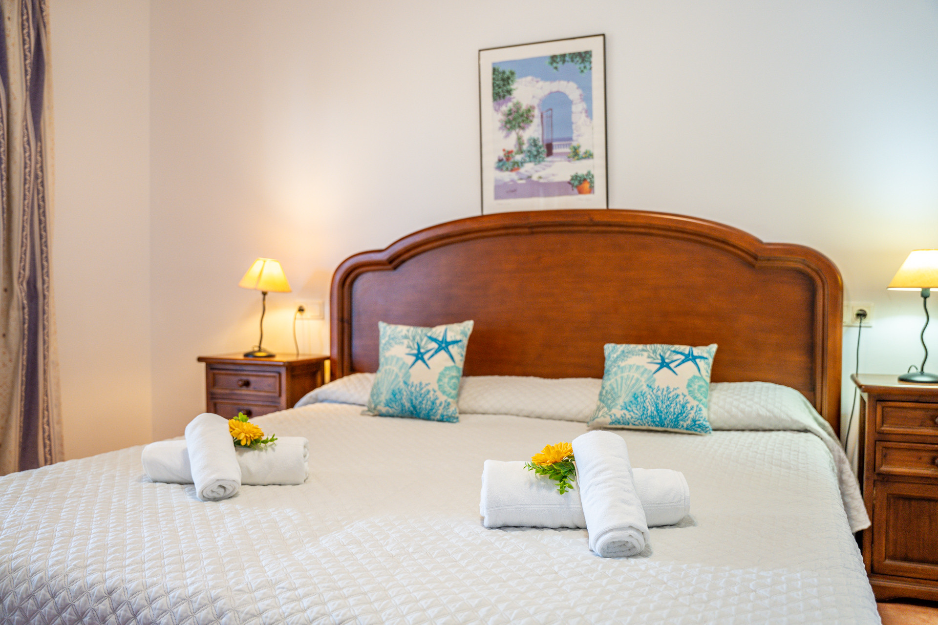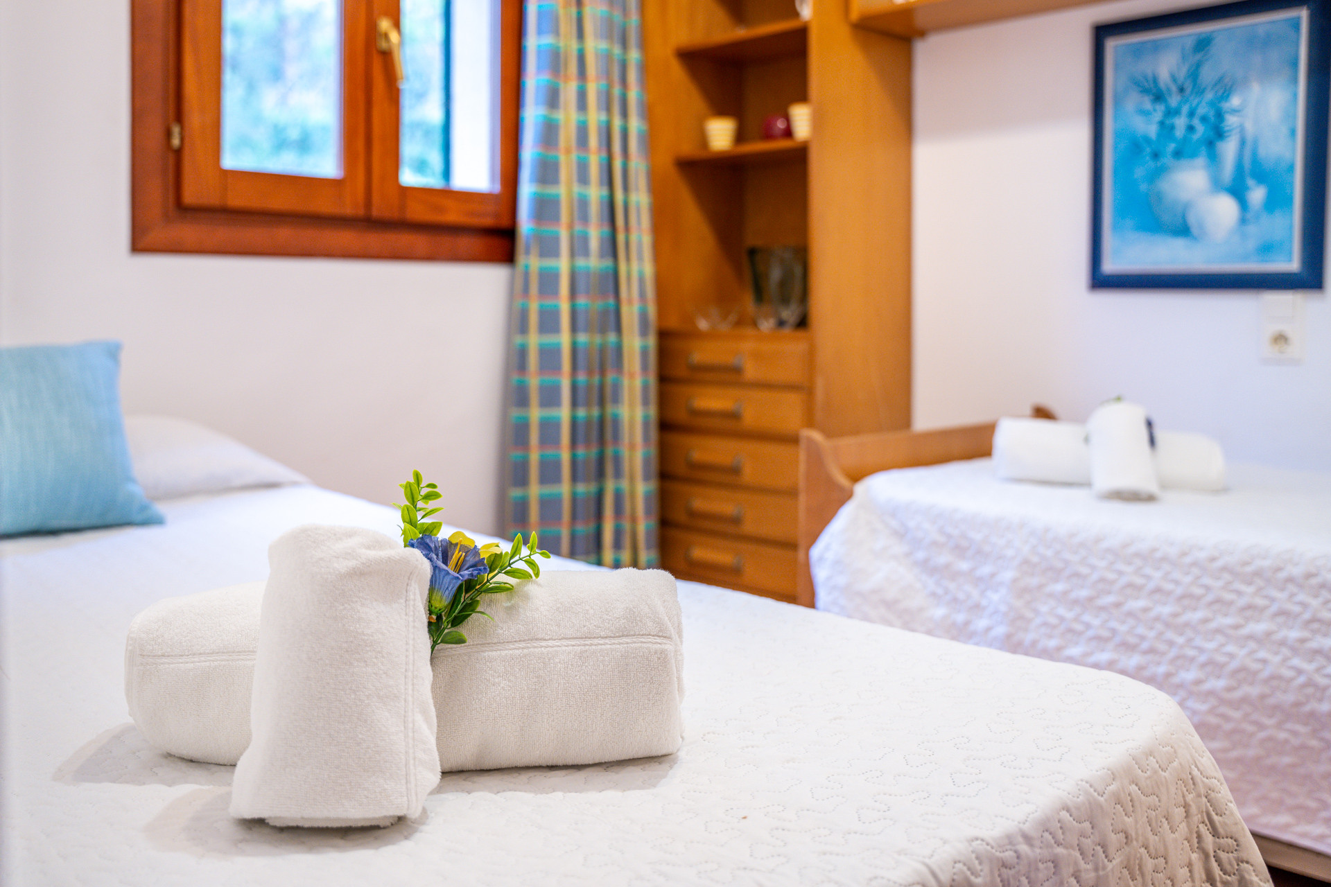 Dans ce même étage se trouvent trois chambres et deux salles de bains. L'une d'entre elles dispose d'un lit double et d'une salle de bain attenante avec douche, tandis que les deux autres sont équipées de deux lits individuels et d'une salle de bain avec baignoire. Toutes les chambres ont un accès à la terrasse et sont équipées de la climatisation.