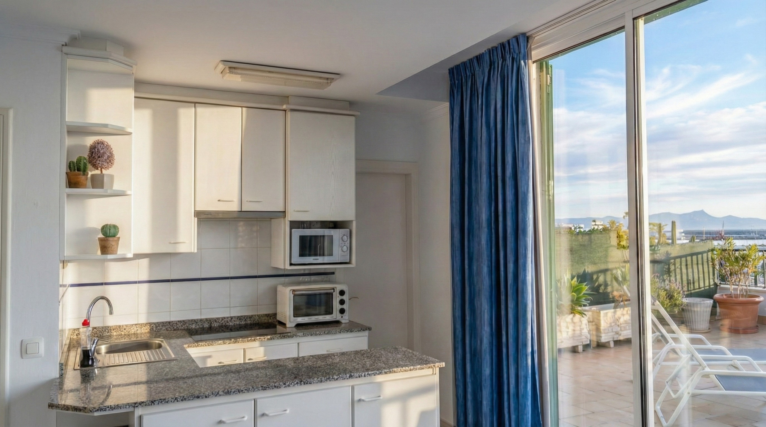 One of the highlights of the attic is the balcony with a panoramic 180º view over the Bay of Alcudia to Cap Formentor and the Tramuntana mountain range. Here you can enjoy the Mediterranean sun from morning to night. The large balcony offers plenty of space to enjoy the sunrise, have a good breakfast in the morning, sunbathe during the day or end the evening in a romantic way with a tapa and a glass of wine. There are 2 comfortable sun loungers at your disposal!