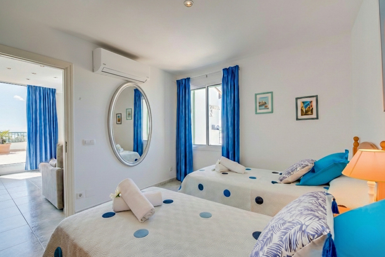 The apartment has a bedroom with two single beds and an air conditioning system that guarantees pleasant temperatures. The living room is also air-conditioned and, together with the fully equipped integrated kitchen, offers a cosy space for relaxed moments. In addition, there is a bright bathroom with a shower.