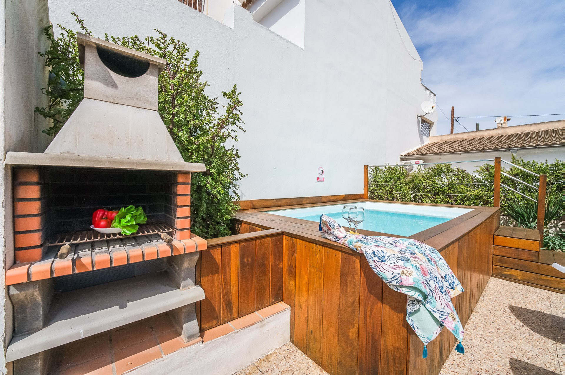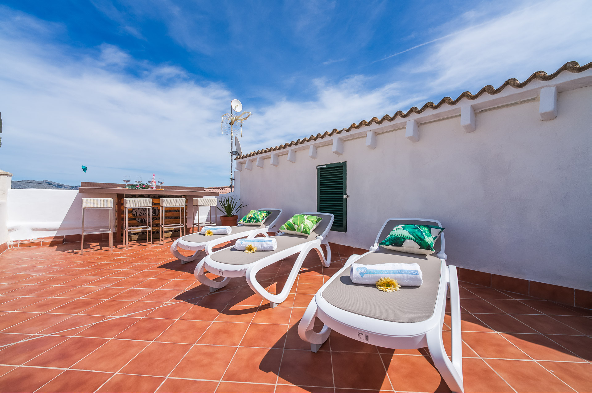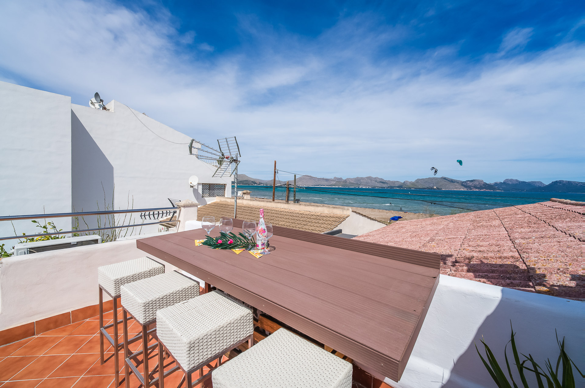 The wonderful terrace has a 2m x 3m swimming pool with a maximum depth of 0.90m surrounded by 5 sun loungers, a table with chairs under an umbrella to enjoy outdoor barbecues and a second terrace on the roof with incredible views of Pollensa Bay beach with a chill-out area and a bar to have a drink while enjoying the sunset.
