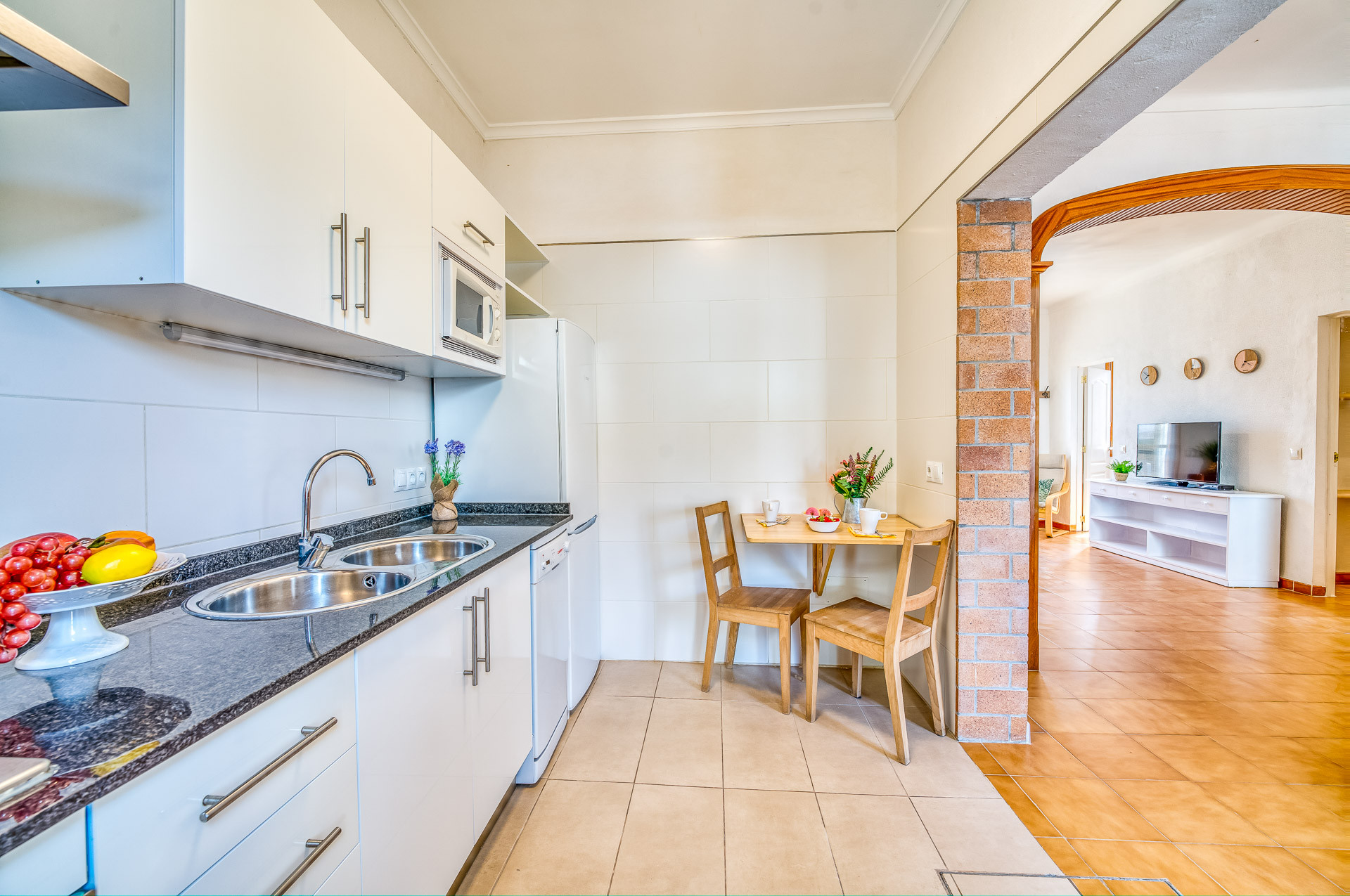 Cas Ferrer is distributed over two floors and offers a bright, modern and welcoming environment. On the ground floor, you will find a spacious living-dining room with direct access to the main terrace, which has a table for 5 people and a barbecue, ideal for outdoor meals. Next to the kitchen, equipped with everything necessary to prepare your favourite dishes, there is a second terrace with a small table perfect for quiet breakfasts or moments of relaxation.