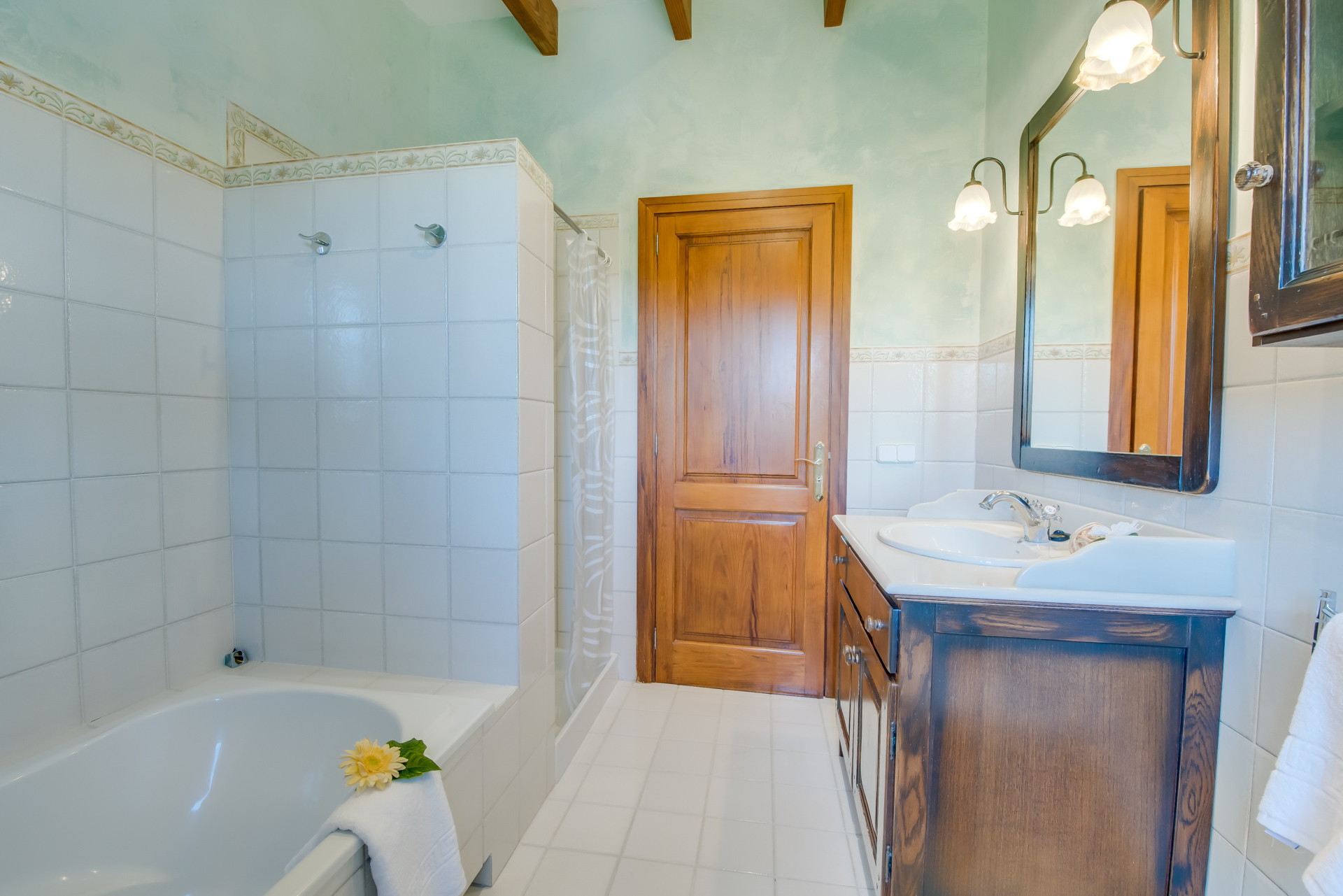On the first floor are the bedrooms, two of them with a double bed and the other with two single beds. On this floor are the two bathrooms that have a bathtub. All rooms have air conditioning.